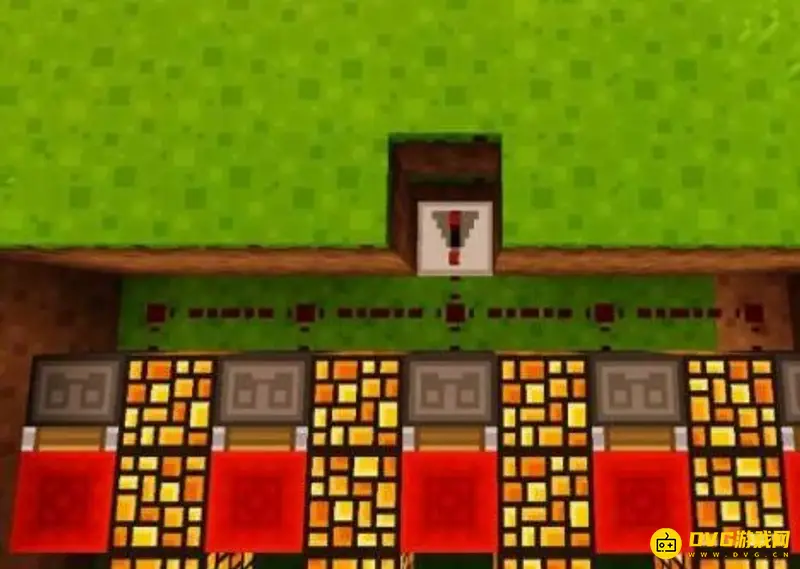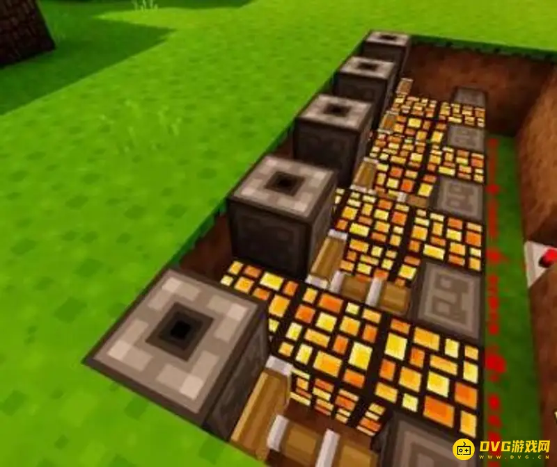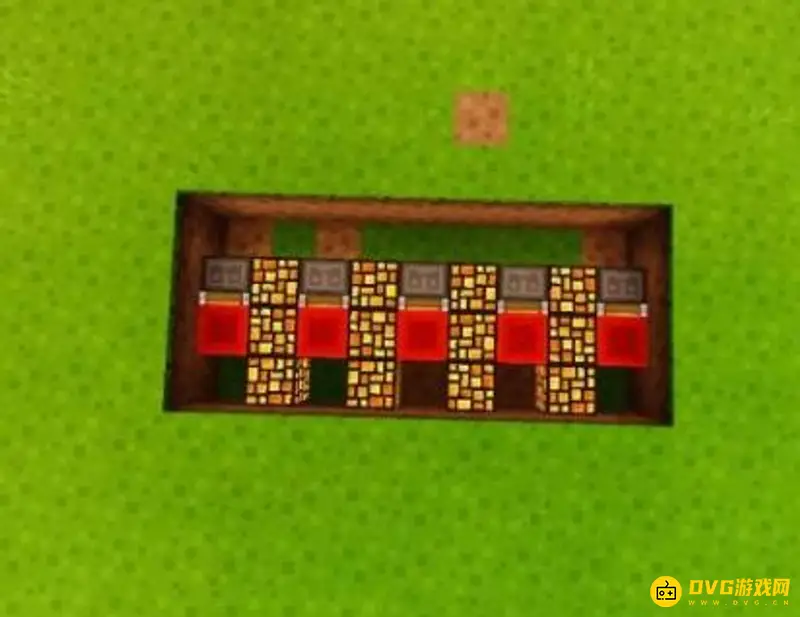 3、在中间两格放上粘性活塞 红石块的组合,每一个组合中间空出一格放上萤石灯,用来防止生成蜘蛛等怪物。注意:粘性活塞要朝向红石块。