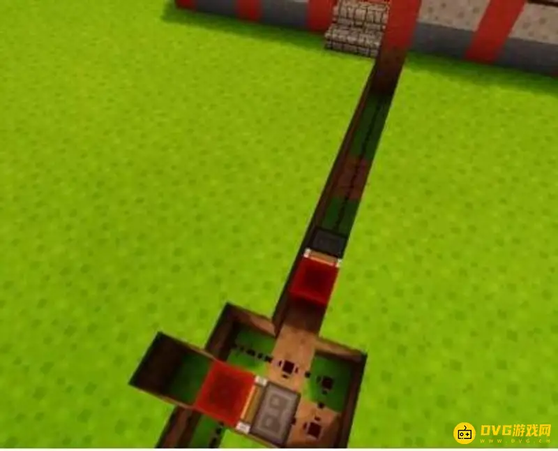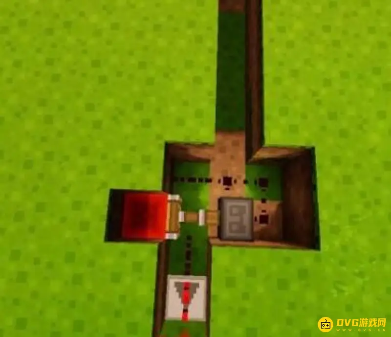 8、在通道的末端地面上放上草方块,草方块上放置一个拉杆。并将拉杆拉下,可以看到红石线路已经被激活了,永动机已经不动了。