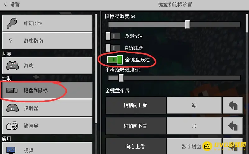 1,首先我们进入设置里,点击左侧键盘和鼠标,开启右侧的全键盘玩法。