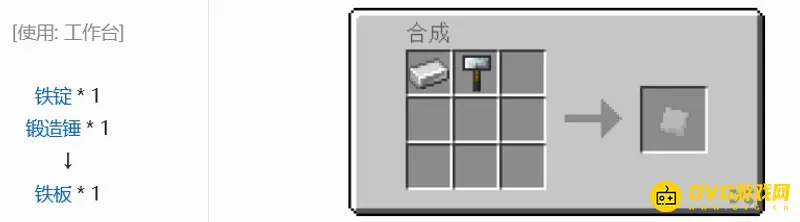 使用一个铁锭和一个锻造锤,在工作台处就可以合成出一个铁板了,铁板是可以合成的基础材料,是很多精密器械的合成材料之一,比如说范围触发器,钛铁合金板。