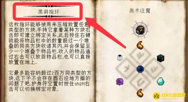 我的世界黑洞指环能够被用来压缩任意类型方块,手持它拿着指定的方块Shift 右键即可绑定此方块。此后按住右键就能将物品栏中数量超过一个堆叠的同类型方块存储其内,也可以直接放置于地上。