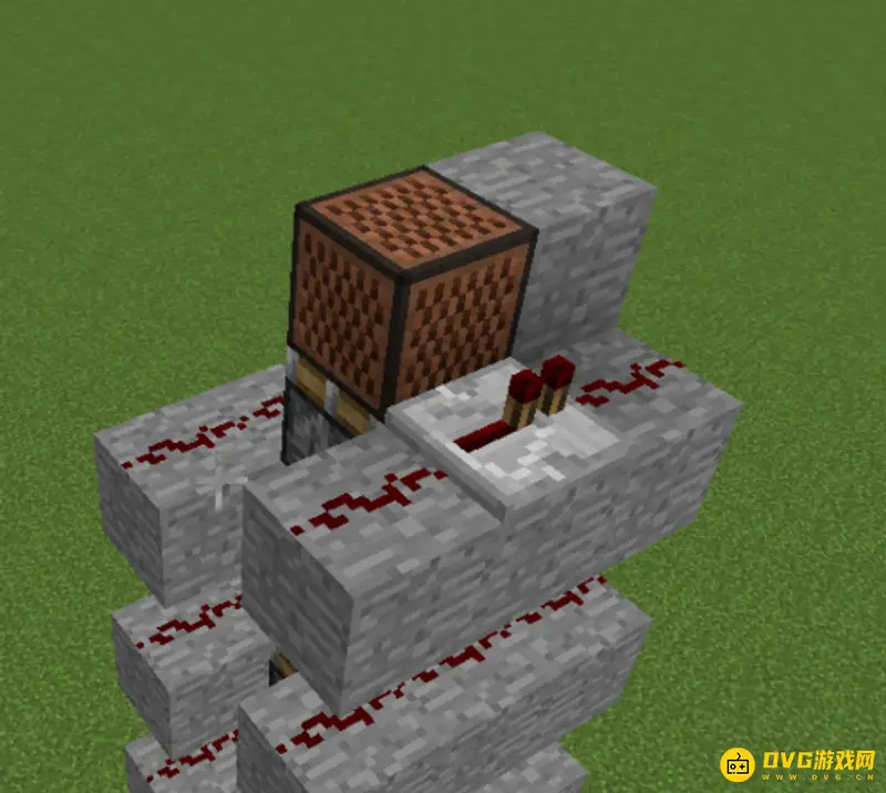 2.按照这样的方式向上,一直铺。然后另一侧跟左侧叉开,也是同样的方法放石头与红石,一直铺到最顶层。最顶层的活塞上方放一个不可移动方块音符盒,音符盒右侧中间的红石打掉,放红石中继器。音符盒后方放任意一个方块。