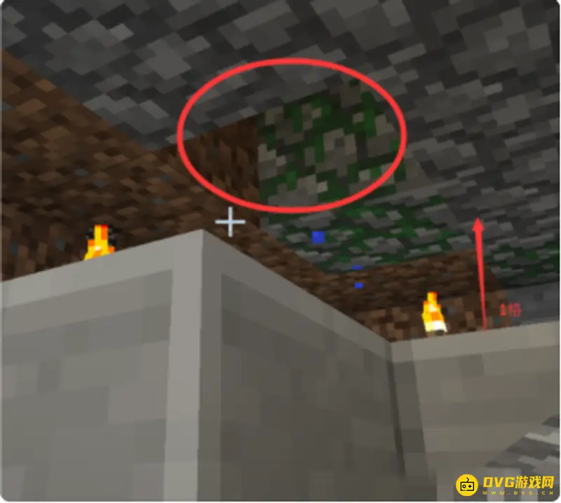 5、找到水流的最大距离之后,向下挖如图,在距离一格位置放置石台阶