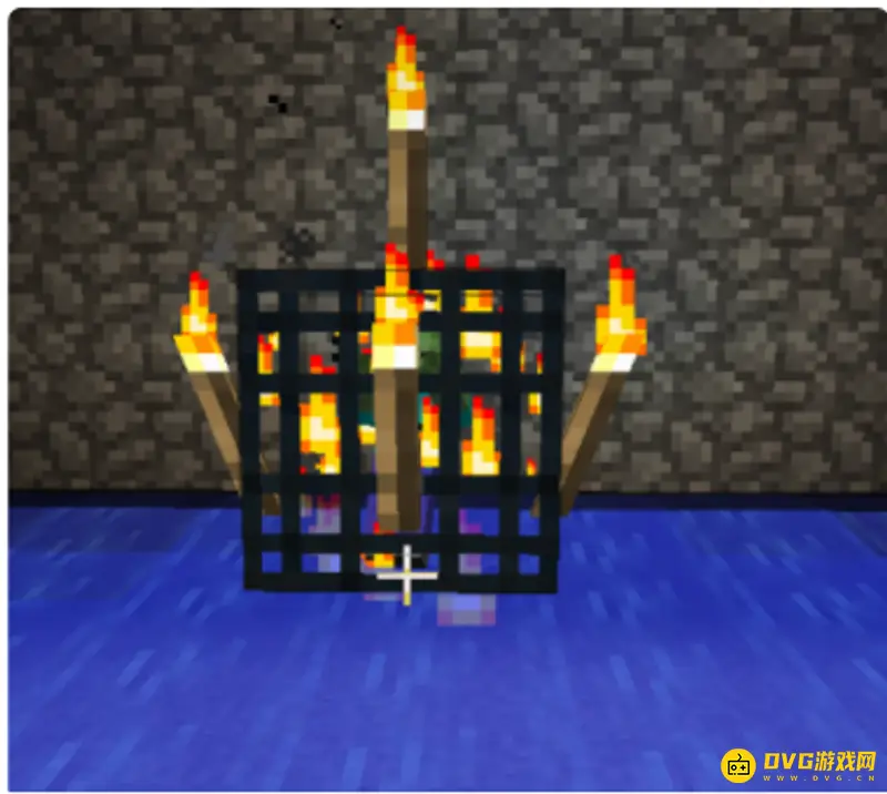 3、在刷怪笼四周插上火把,这样的目的是为了防止刷怪笼刷怪,因为刷怪笼在亮度高于7的情况下是不会刷怪的。然后在刚刚上方的横向地方都放上水,水会自上向下流下来。