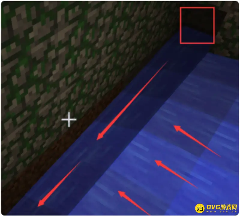 4、在水流的最大距离(8格)的第9格向下挖一格,并倒入水,然后顺着水流的方向找到水的最大距离,并打掉刷怪笼上的火把,让刷怪笼开始刷怪。