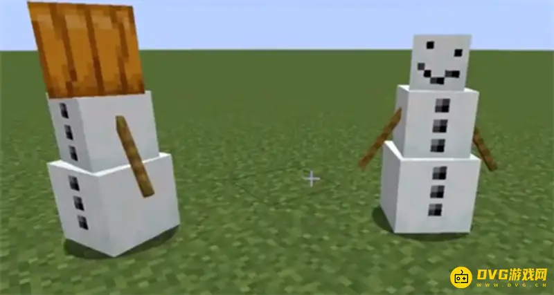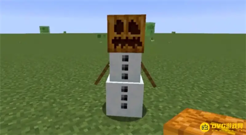 1、我们需要堆叠2个雪块,然后在顶端的位置防止一个雕刻过的南瓜或者南瓜灯,需要注意的是,雕刻过的南瓜/南瓜灯必须在最后放置才能生效。