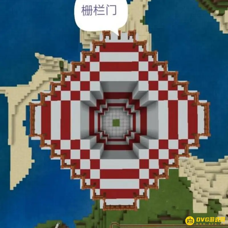 3.接下来就是建造塔顶了,先把顶部向4周扩建四格,然后围上栅栏,四周放置栅栏门。