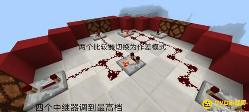 6.接下来是最重要的,铺设红石循环路线,如图所示安放好中继器,比较器,红石,调节中继器,安放红石火把为线路提供能量。