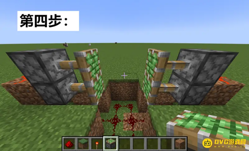 4.第四步:在第三步放置方块的两边,各放置两个黏性活塞。这四个黏性活塞就是当前负责开关隐藏门的主要工具。
