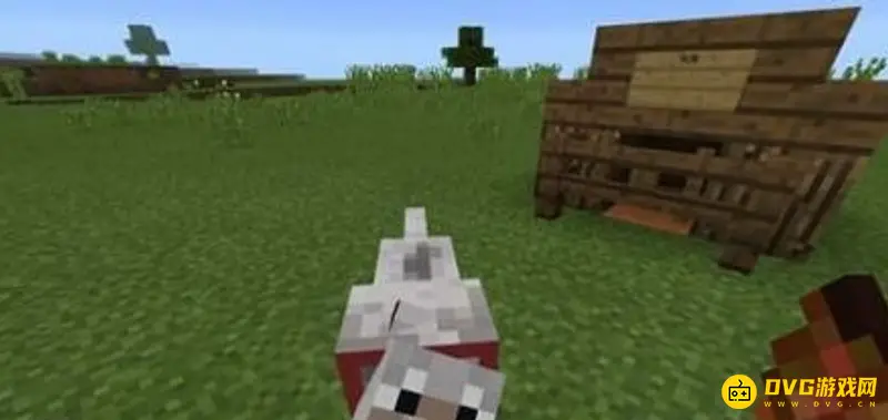 4.铺上自己喜欢的颜色的羊毛,用木板补好屋顶,放置栅栏,栅栏门,告示牌把狗用楼召唤过来,让其 坐下,推进去。