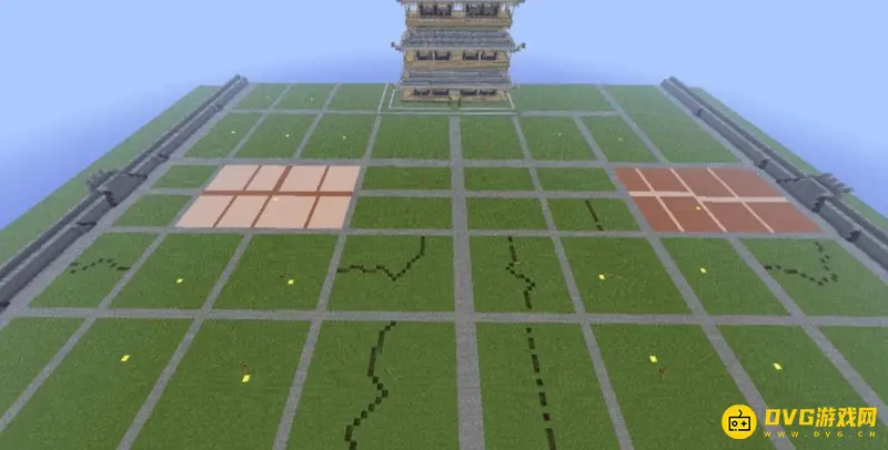 1、开始建造20x20唐风建筑之前,我们最好先准备一片平整的场地,在场地中,我们进行道路的铺设,将场地分为一个一个的小方格
