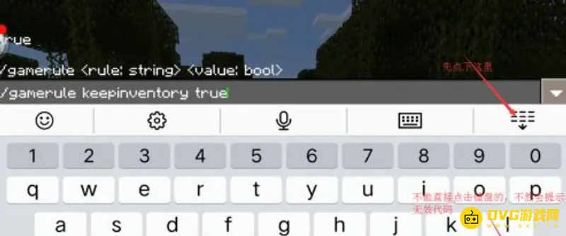 4.然后输入代码“/gamerule keepinventory true”。true是开启。false是关闭。游戏默认false。输入完毕后不能顺手点击按键发送出去,不然会提示代码无效。先点击键盘又上的缩小键。
