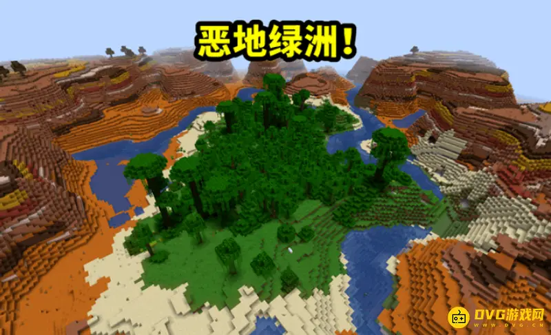 这个种子的出生点在一片雨林里面。我们的目的地是那片被包围的雨林。输入/tp -67 71 -750,可以看到,在周围全是恶地包围的情况下,这里生成了一小块的雨林群系。这真是一个神奇的生成,简直就是恶地中的绿洲。