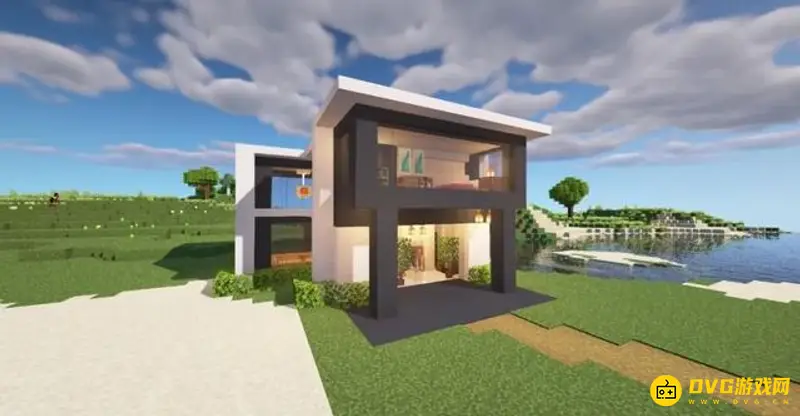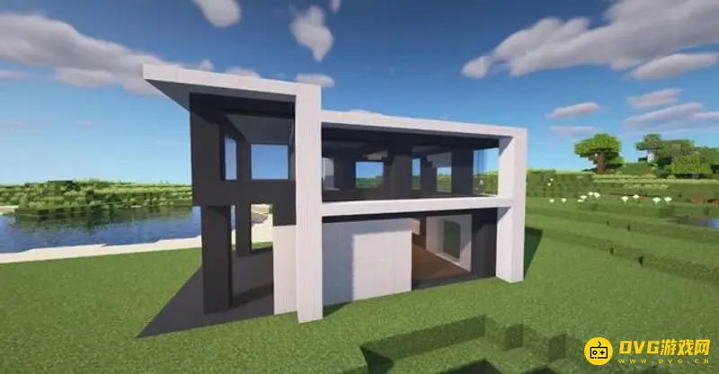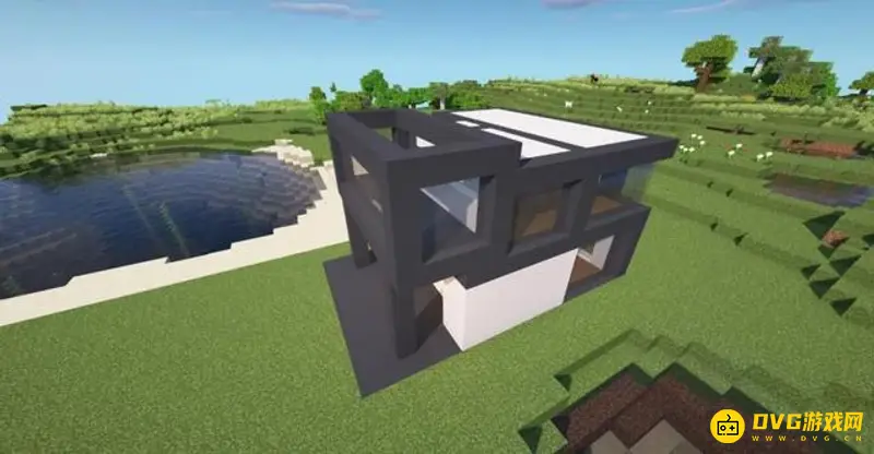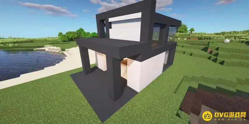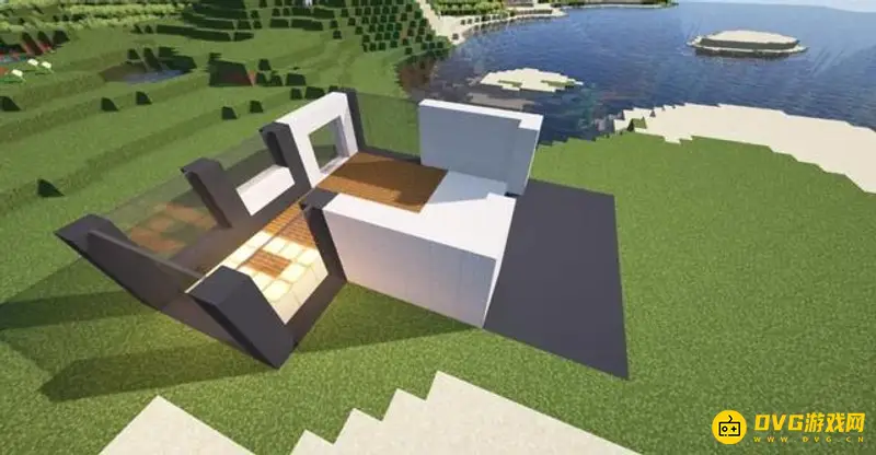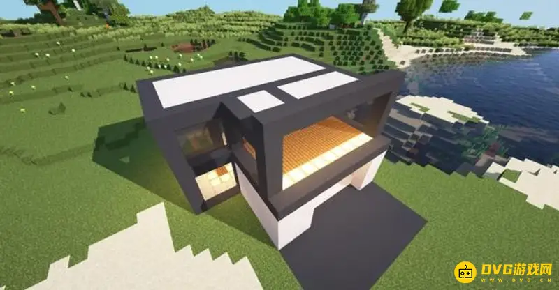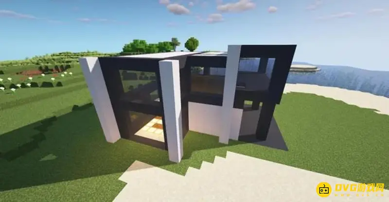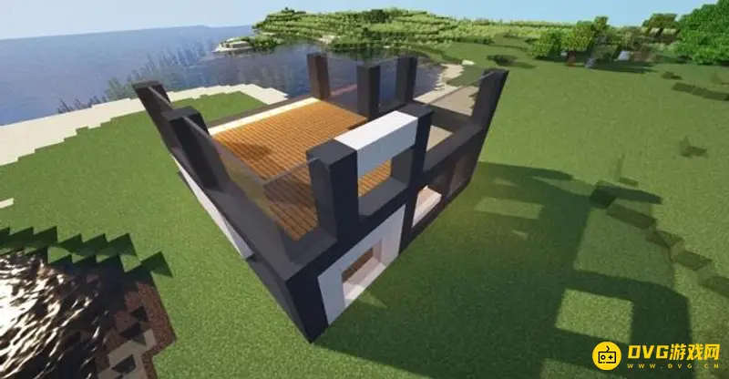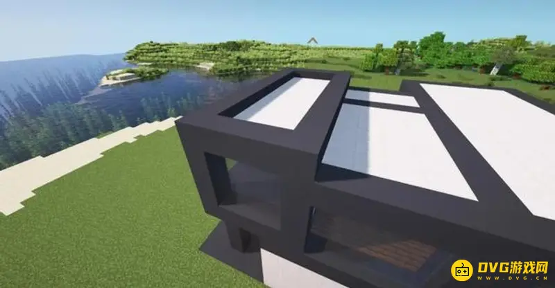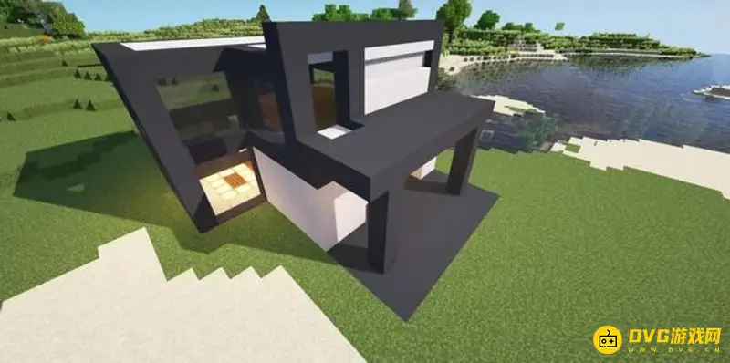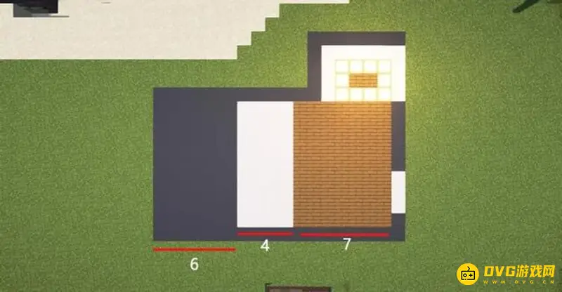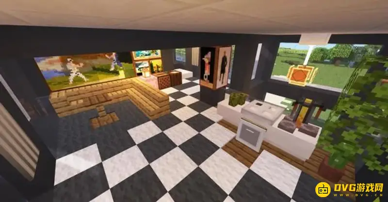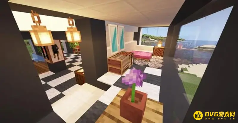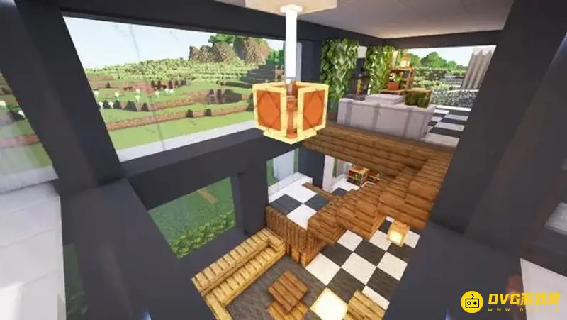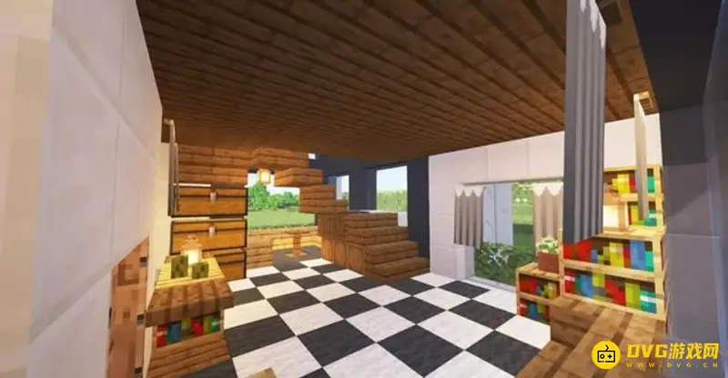 21、按照图中位置搭出通往二楼的楼梯。并且在客厅的地面铺上黑色和白色羊毛地毯,让地板不会那么单调