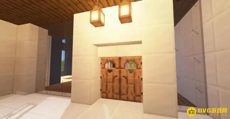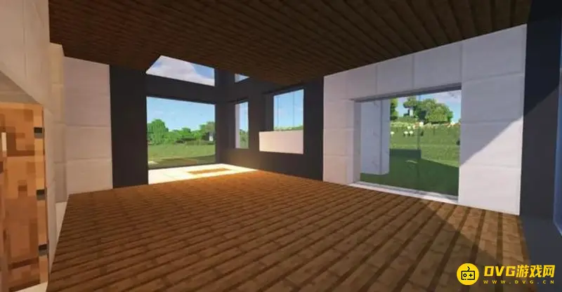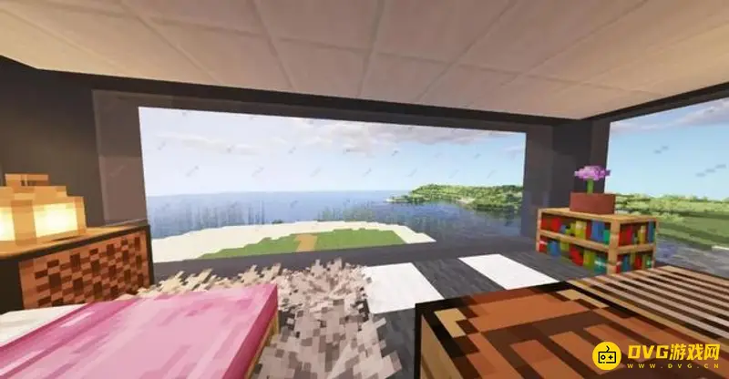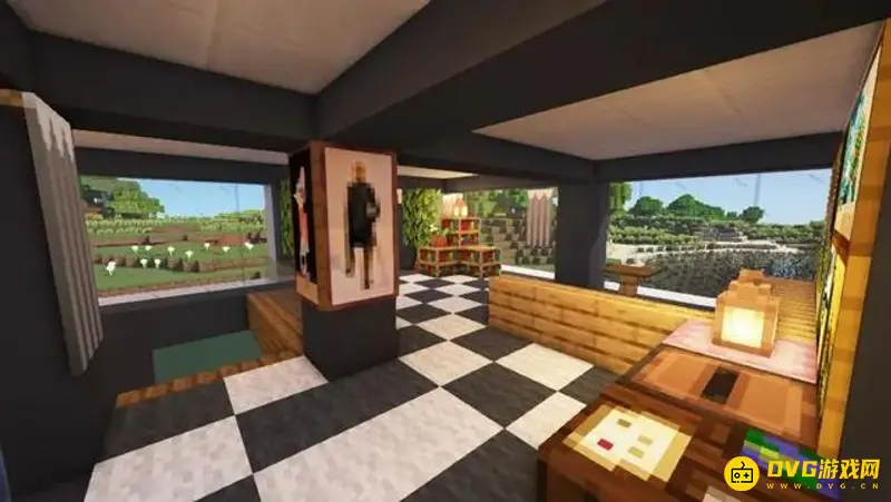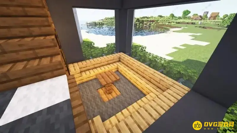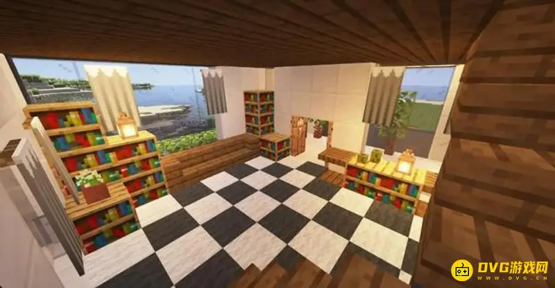 22、墙角放置一些书架,窗户上挂上“窗帘”,使用任意的楼梯方块做成“椅子”,让房间的生活气息更丰富一点