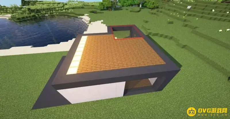 6、然后使用灰色混凝土、海晶灯、云杉木板做出第一层的房顶,红框区域不做铺设