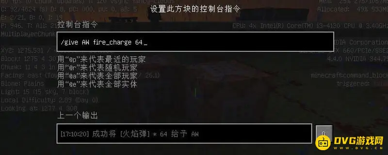 在我的世界游戏中,命令方块给予物品指令为/give人物id空格物品id数量,数量默认是64个。示例:/give AW fire_charge 64意思是给玩家AW64个火焰弹。