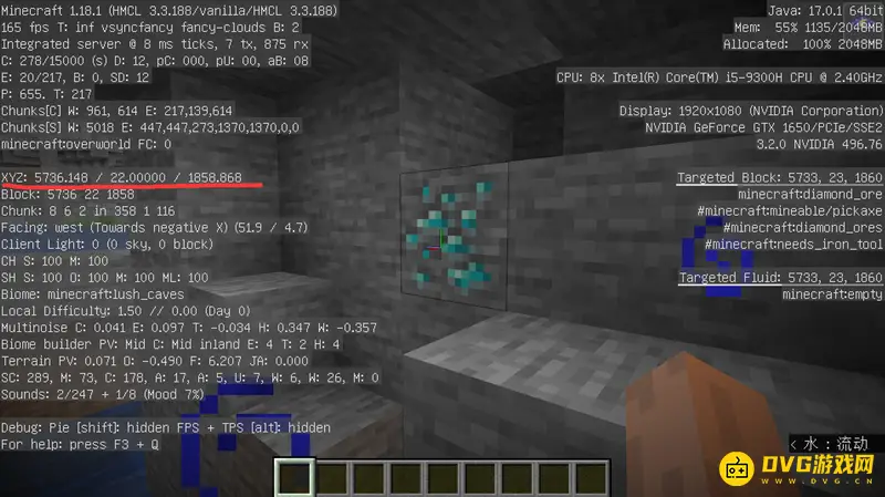 2、可以看到玩家在高度为22的地下中,发现了一个钻石矿。