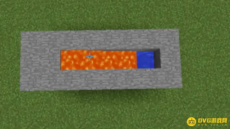 3、在水的上方倒入一桶岩浆,岩浆遇到水会变成石头。岩浆不要碰到水的初始位置。