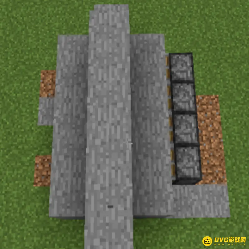 5、活塞的后方放一排石头,上面铺上红石,地下也铺一下红石。