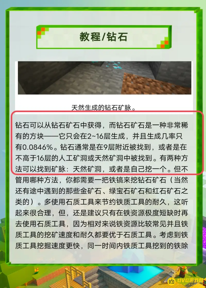 钻石矿石是一种非常稀有的方块——它只会在2~16层生成,并且生成几率只有0.0846%。钻石通常是在9层附近被找到,或者是在不高于16层的人工矿洞或天然矿洞中被找到,可以在天然矿洞里面找到。