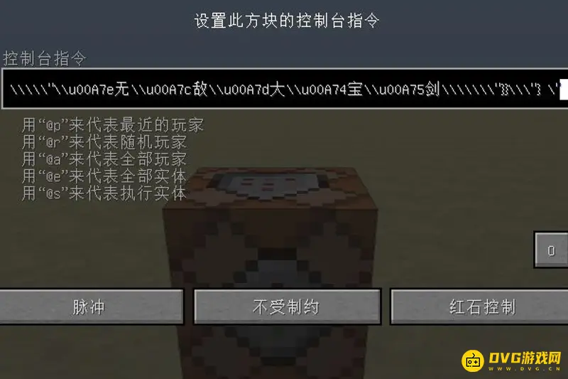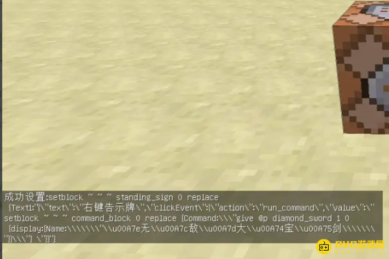 5、右键命令方块打开命令方块的编辑界面,输入以下指令:setblock ~ ~ ~ standing_sign 0 replace {Text1:"{"text":"右键告示牌\",\"clickEvent":{"action":"run_command","value":"setblock ~ ~ ~ command_block 0 replace {Command:"give @p diamond_sword 1 0 {display:{Name:"u00A7e无\\u00A7c敌\\u00A7d大\\u00A74宝\\u00A75剑\\\\"}}"} "}}"}