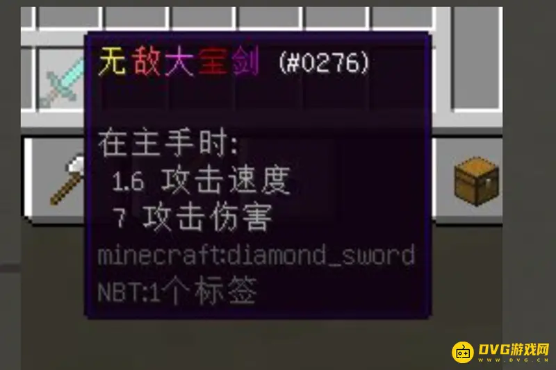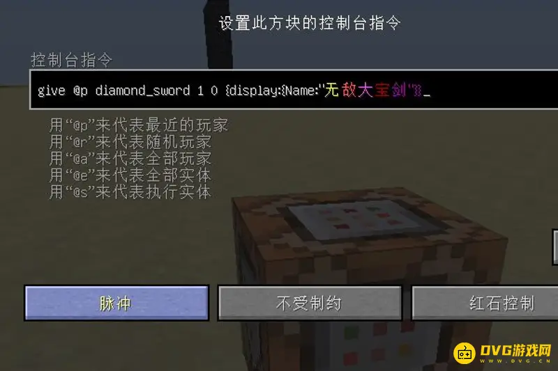 12、关闭命令方块编辑界面,右键按钮,运行命令方块,得到一把钻石剑。得到的钻石剑就是彩色字体的。