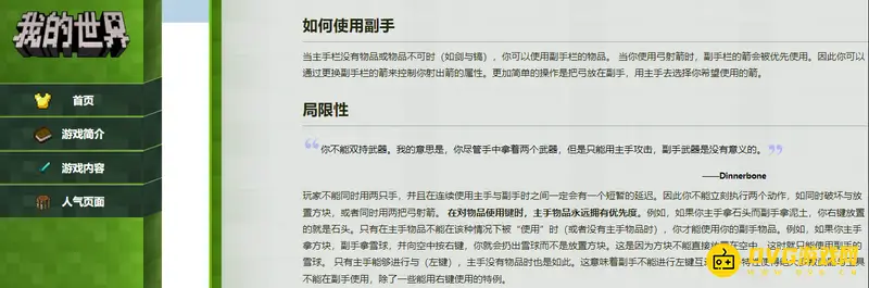 (2)下面还有一些使用小技巧:玩家现在可以使用鼠标的左右键使两只手执行不同的动作。例如,如果玩家主手持镐,右手拿火把,右键就会放置火把。这是因为镐没有右键互动,游戏就会尝试去用副手栏物品实现右击动作。玩家不能同时点击左右键。玩家可以把物品栏中的物品放在副手栏上并且副手持该物品。副手栏上有一个盾牌图案以便区分。按F(默认)将切换主副手物品(包括空物品栏)。当副手栏不为空时它会在快捷栏边上显示,右手玩家对应左边,左手玩家相反。只有主手可以用来攻击或破坏。右键造成效果者例外,如弓与喷溅药水。使用弓时,箭的选择取决于玩家的物品栏与副手栏。副手栏的箭优先度最高。若无,最接近第一栏的箭优先度最高。若弓在副手,已选定的快捷栏中的弓优先。若有多种箭,但是没有一种位于副手或主手上,第一快捷栏中的箭被优先使用。第一人称视角下,空的副手不显示。在基岩版中,副手可以携带箭,盾牌与不死图腾。盾牌可以通过潜行使用。