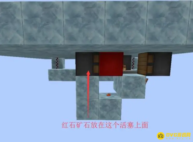 3、然后在刚才座的开关上面铺上方块伪装起来,在活塞上面放上一个红石矿。
