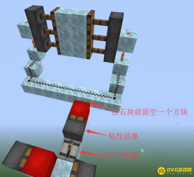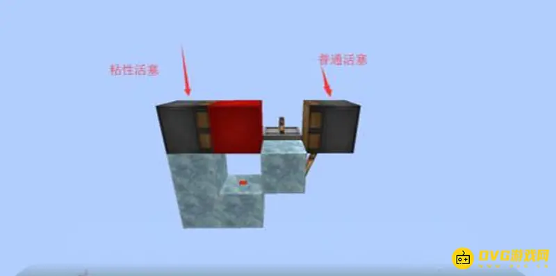 1、首先按位置摆好各个方块与活塞,这将用来当做开关。利用红石信号激活时推动红石块与拉回。