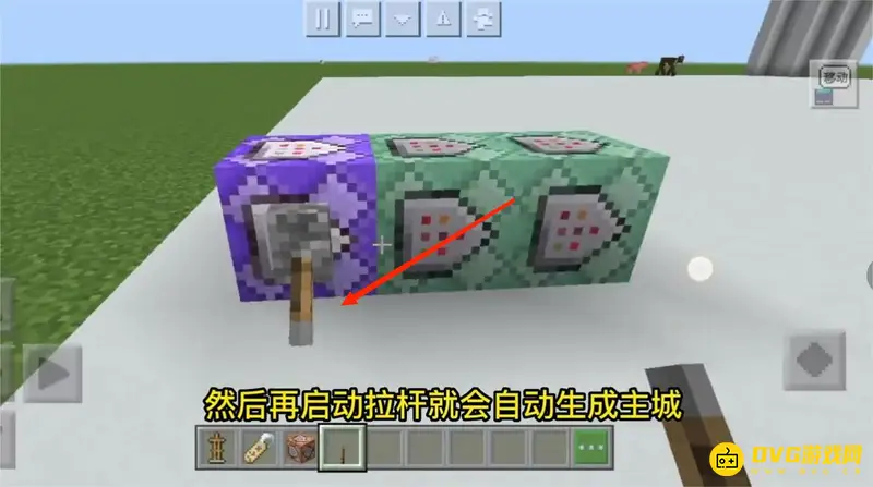 5、最后以循环类型的命令方块为起点,依次在命令方块中输入指令即可,设置好后使用拉杆就能生成主城。
