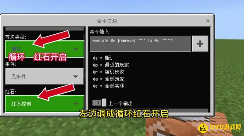 4、将循环类型的命令方块设置为【无条件】和【红石控制】,连锁类型的命令方块设置为【有条件】和【保持开启】。
