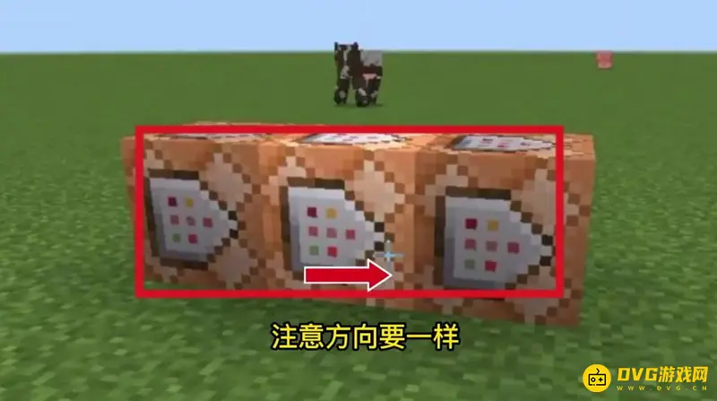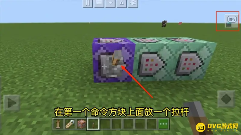 3、把四个命令方块横着放在地上,循环类型的命令方块需要放在最左边或最右边,并在循环类型的命令方块上方拉杆,注意只有在潜行状态下才能放上去。