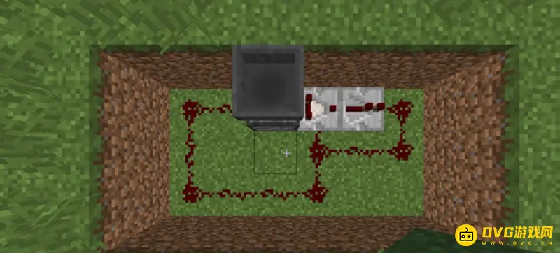 5、如图,挖开周围的方块,并如图所示放置比较器、中继器、红石粉,注意比较器和中继器的摆放方向。