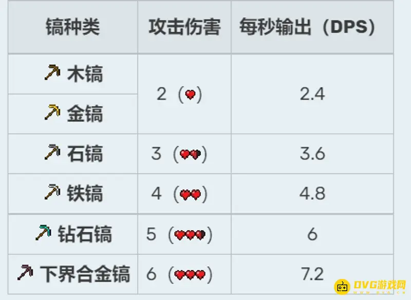 2.攻击伤害和攻击速度排名:①:下界合金镐②:钻石镐③:铁镐④:石镐⑤:木镐、金镐