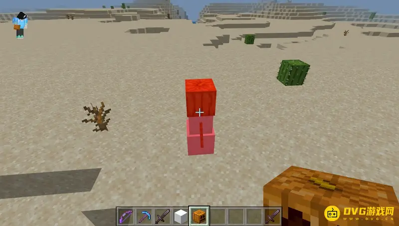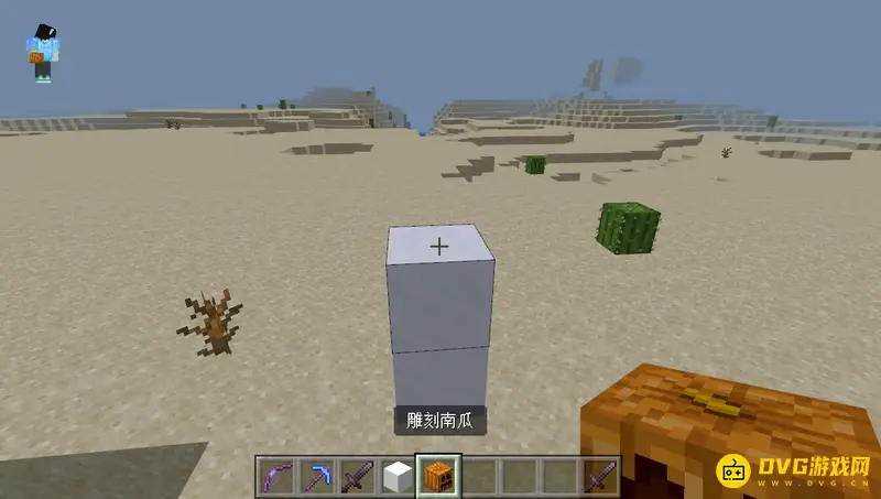 1,例如我们可以去沙漠中发一个雪傀儡,首先放两个雪块,接着在上方放一个南瓜头。