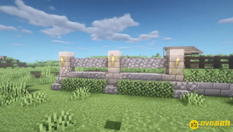 最后在围墙的第二层放置一排台阶在柱子上放置火把再往柱子上放置平滑石,台阶这样警戒围墙就建成了