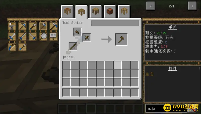 4、在右侧能够看到手斧的基础说明,并可以看到手斧需要用到手柄,斧刃和绑定结。我们记住这三个组件名称,点击上面的标签页,找到模具加工台界面并打开。向模具加工台里面放入一些空白模具,但后就可以在左侧选择模板制作,做好以后放入右侧格子中即可。此处的格子非常智能,每放一个模板进去都能增加出一个新的空格子出来。