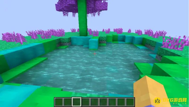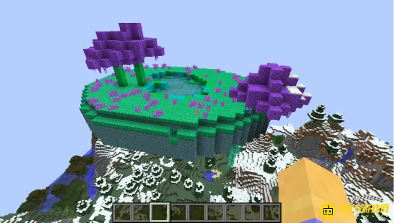 3、接下来是史莱姆空岛的生成。在主世界的天空中会经常见到史莱姆空岛,有两种颜色的——绿色和紫色。在上面无一例外都会生成几棵史莱姆树,一滩史莱姆液,以及遍布空岛的史莱姆块和泥土。