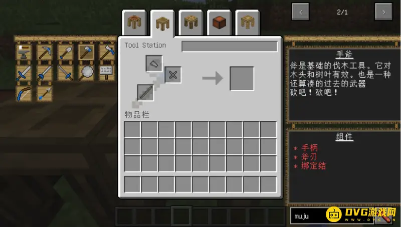 7、这样,我们终于得到了想要的部件。制作好手柄、斧刃、绑定结部件后,再次回到我们的工具装配台,打开手斧界面,依次放入各个部件,就能做好一把手斧。