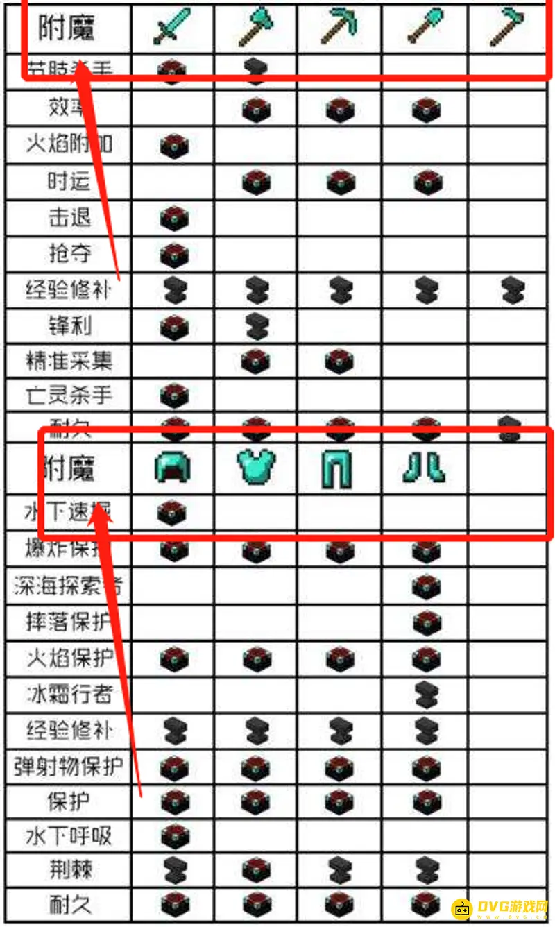 保护:Protection(头盔,装甲,鞋子,裤子)。抗火:FireProtection(头盔,装甲,鞋子,裤子)。摔伤保护:FeatherFalling(鞋子)。爆炸保护:BlastProtection(头盔,装甲,鞋子,裤子)。水下呼吸:Respiration。