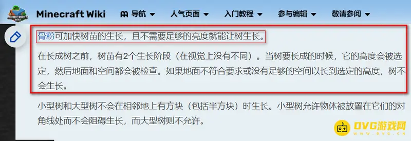骨粉可加快树苗的生长,且不需要足够的亮度就能让树生长。在长成树之前,树苗有2个生长阶段(在视觉上没有不同)。当树要长成的时候,它的高度会被选定,然后地面和空间都会被检查。如果地面不符合要求或没有足够的空间以长到选定的高度,树不会生长。