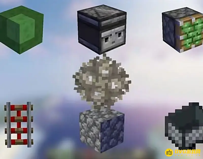 1、我们提前准备好粘液块、侦测器、粘性活塞、激活铁轨、石墙、矿车和珊瑚扇。