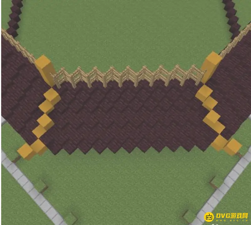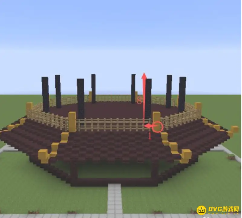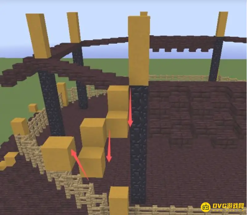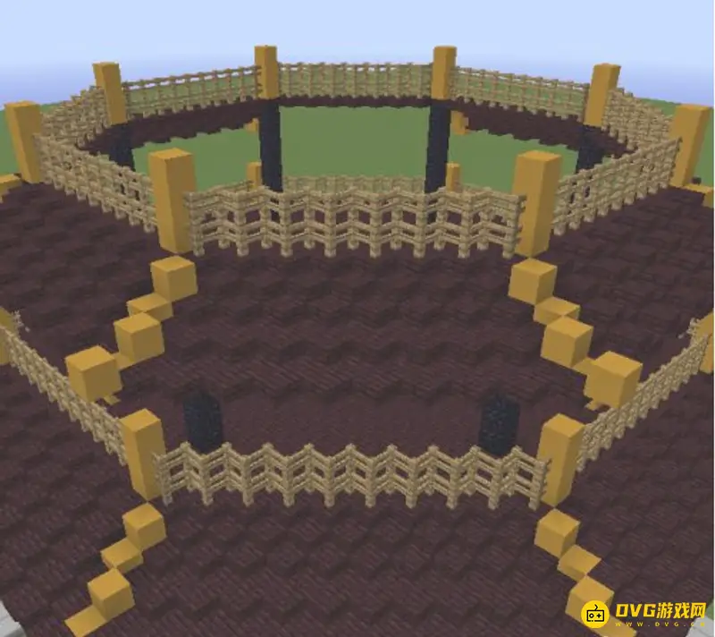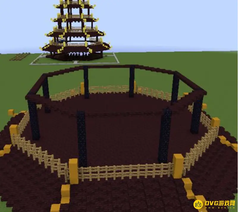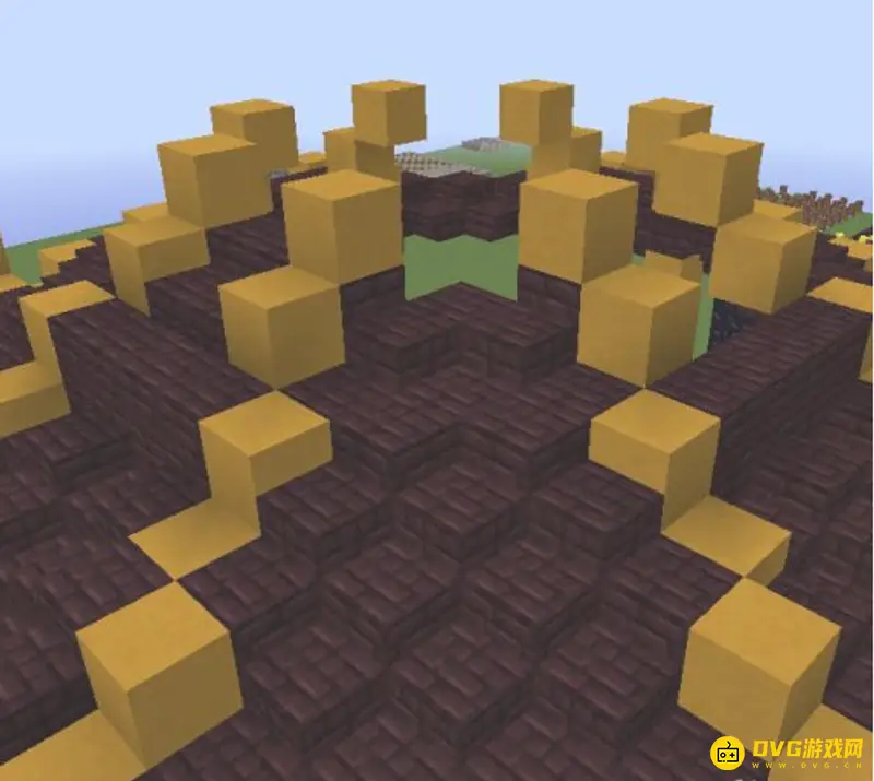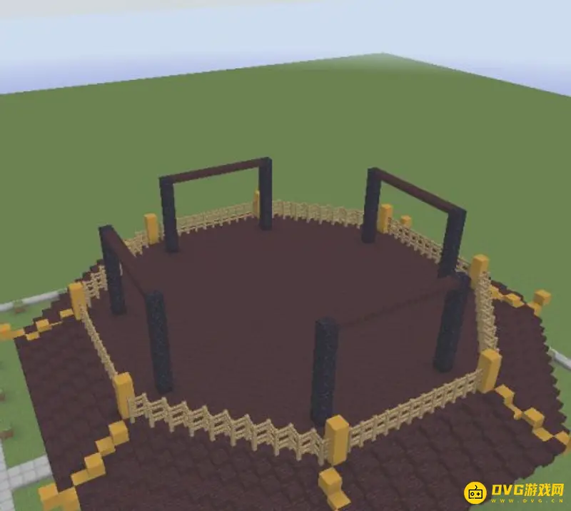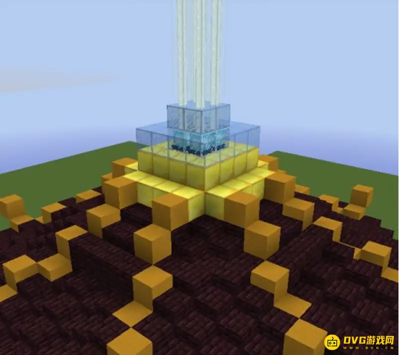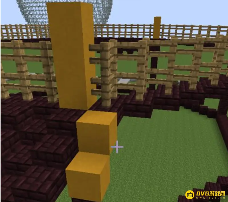 25.中间区域填满地狱砖,然后从黄色柱子向内收一格,向前推3格的区域放8格高的黑曜石。黑曜石上面再放3格黄色粘土。