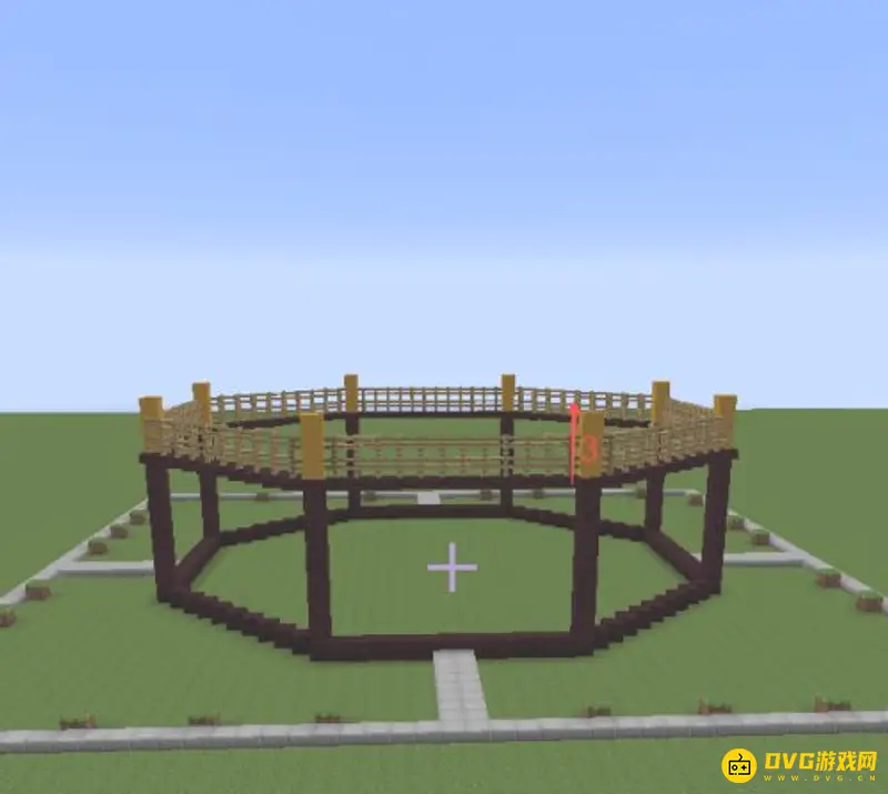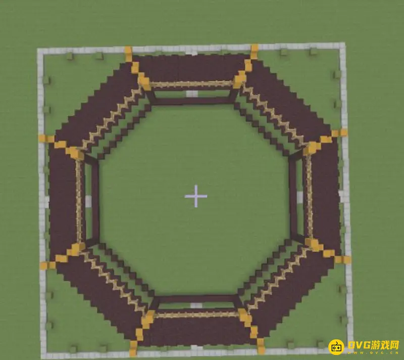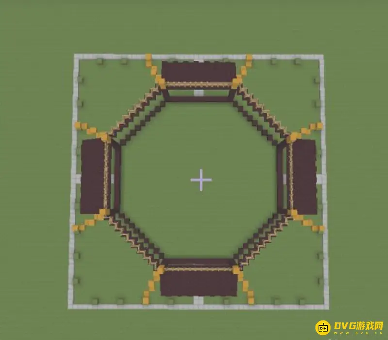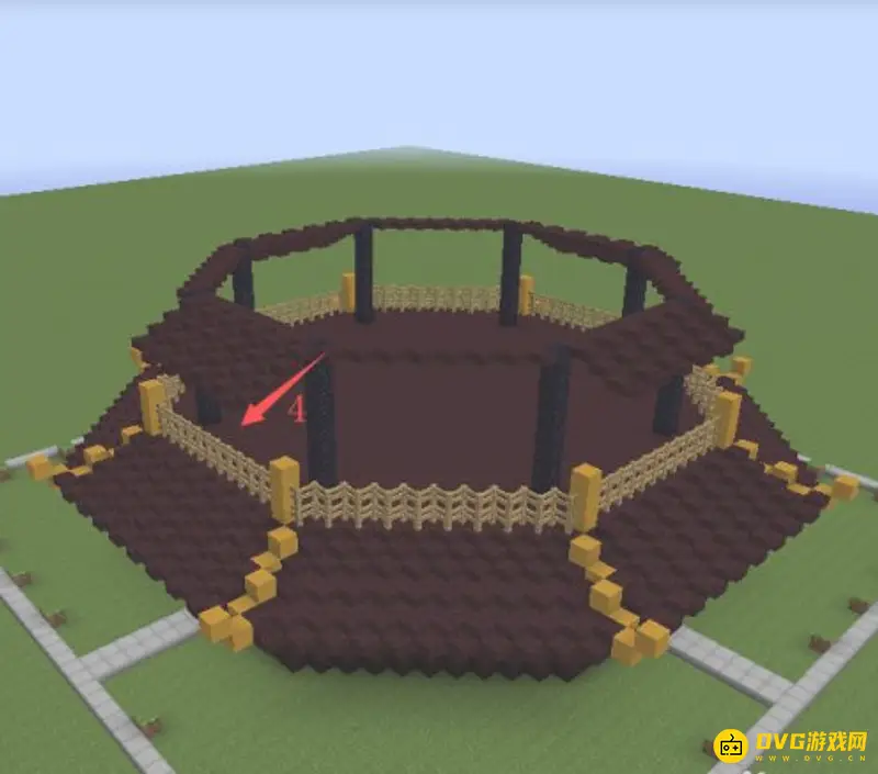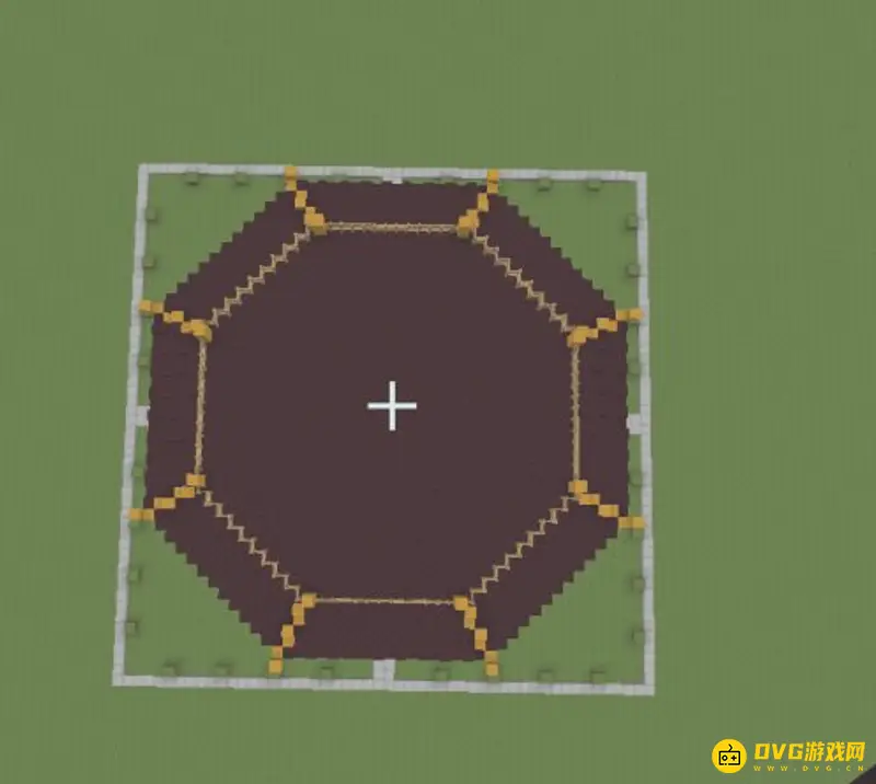 6.在八格的地狱砖上面再提高三格的黄色粘土。然后用地狱半砖跟第一层一样的做法连接成八边形,并在上面放置木栅栏。