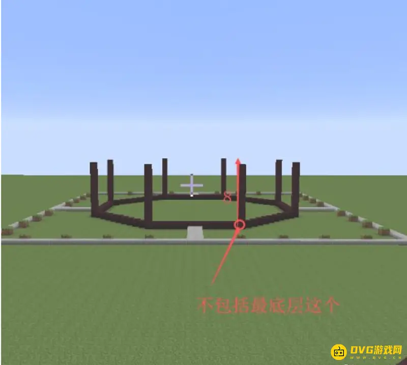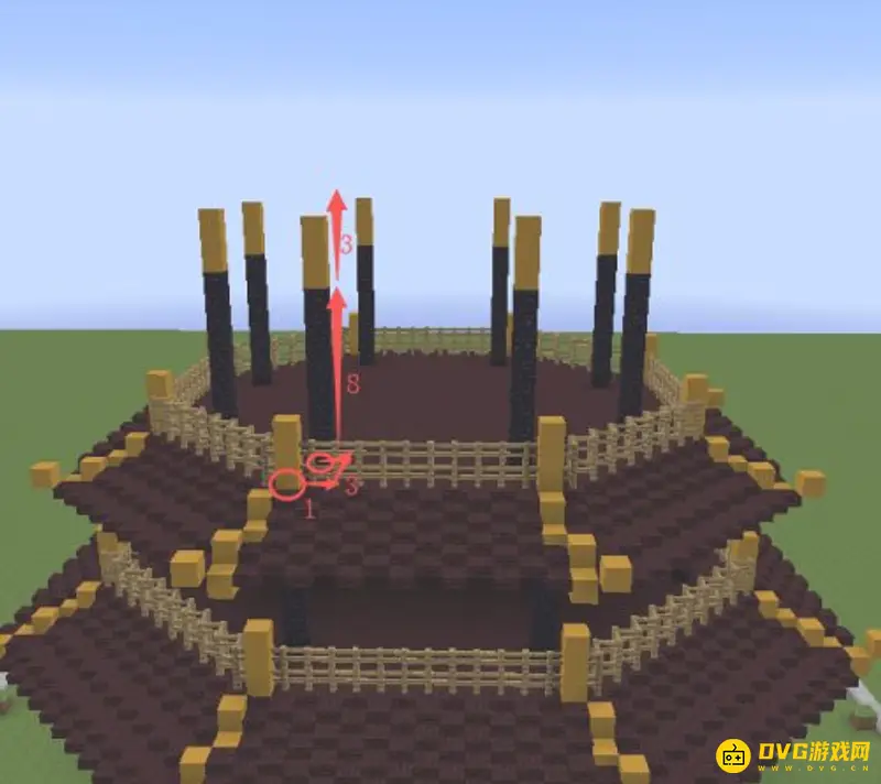 19.然后以黄色柱子为基准向内收一格,向后收三格的位置开始铺8格高的柱子。