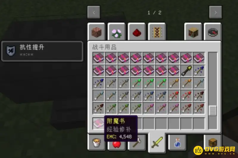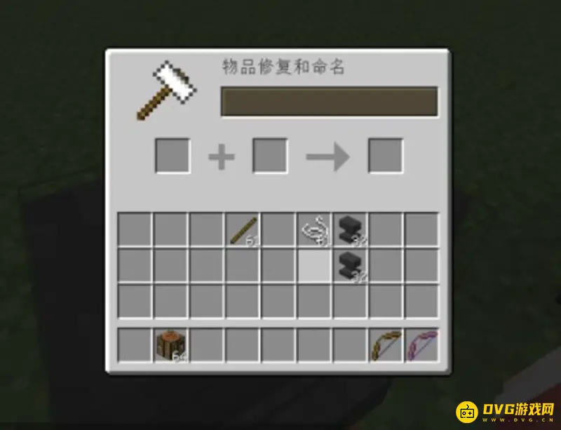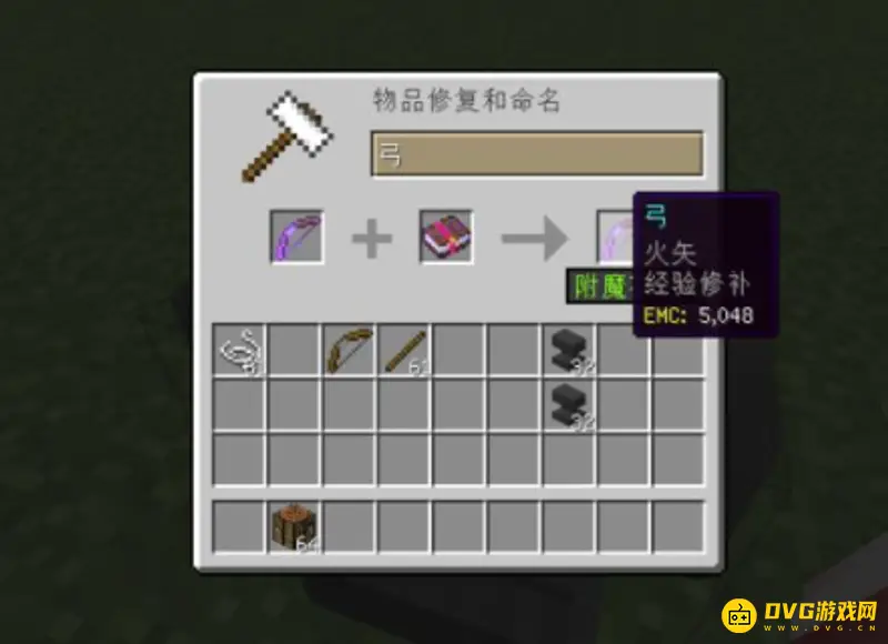 4、前方放置附魔弓箭,后方放置附魔书,然后合成,然后通过获得经验的方法修复弓箭