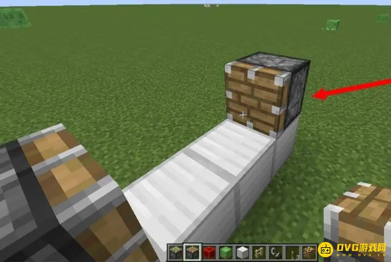 7、接着在上边靠近普通活塞的粘液块上放一个方块,这就是挡着你的,你就站在这个方块的前面,也就是图中箭头指的位置
