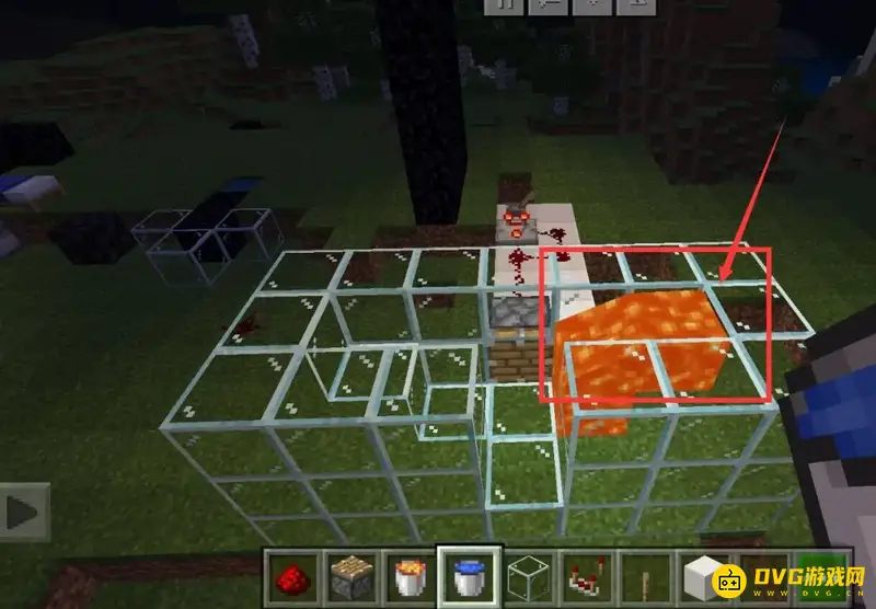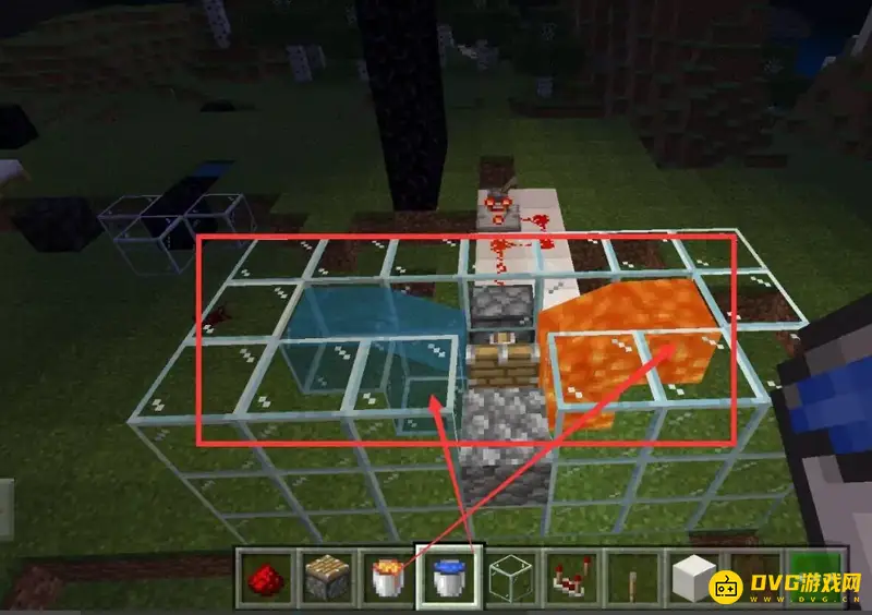 1、利用水和岩浆碰撞生成石头的原理建建造刷石机,原料准备:一个活塞、一桶岩浆、一桶水、一个红石比较器、一个拉杆开关、若干玻璃方块、若干红石粉。