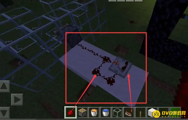 4、用红石粉把活塞尾部和红石比较器连接起来,制作脉冲电路,红石线路至少要三格方块距离,保证脉冲时间间隔,然后把拉杆开关安装上,激活脉冲电路。